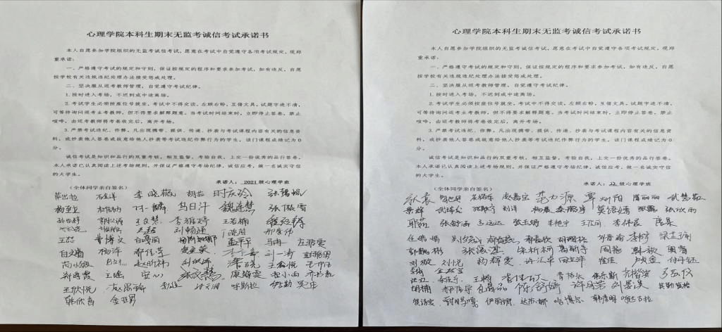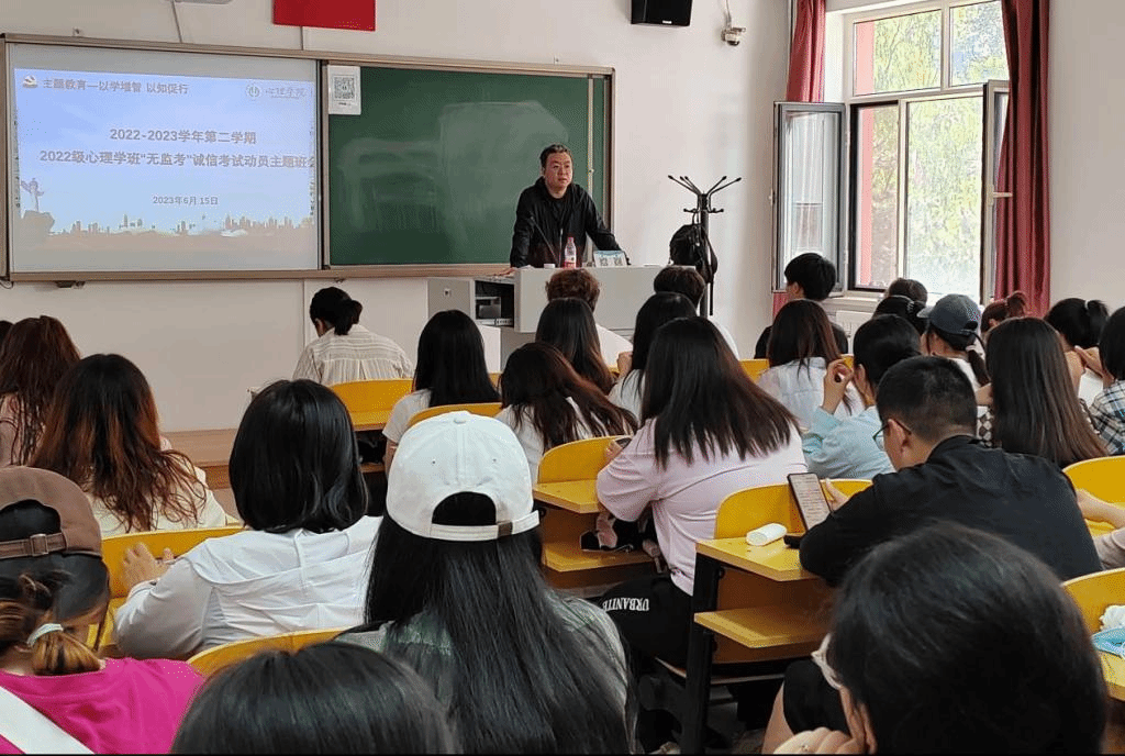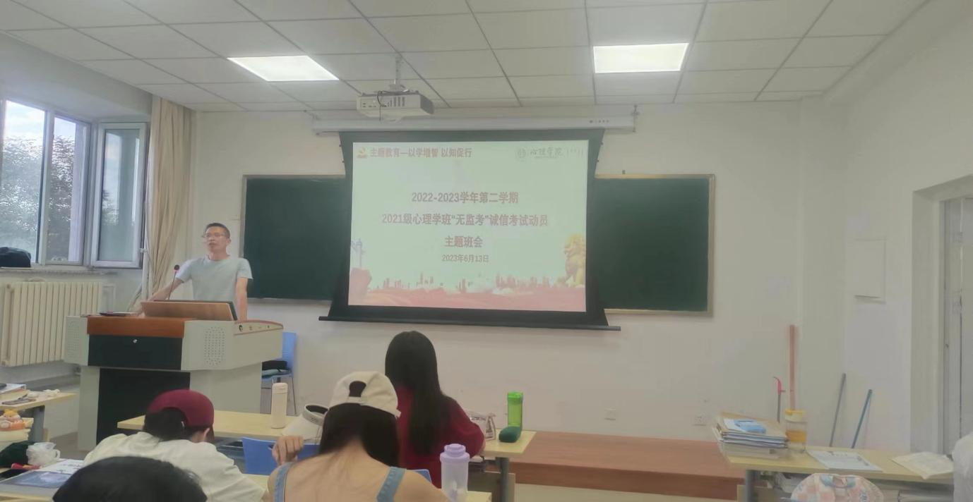 在主题教育推进之际,为进一步加强学院学风建设,做好学生诚信考试教育,确保本学期期末考试顺利进行,近日,新2最新登录口2021级、2022级心理学班分别召开2022-2023学年第二学期“无监考”诚信考试教育主题班会。主题班会分别由班主任董洪杰、梁宏宇主持。