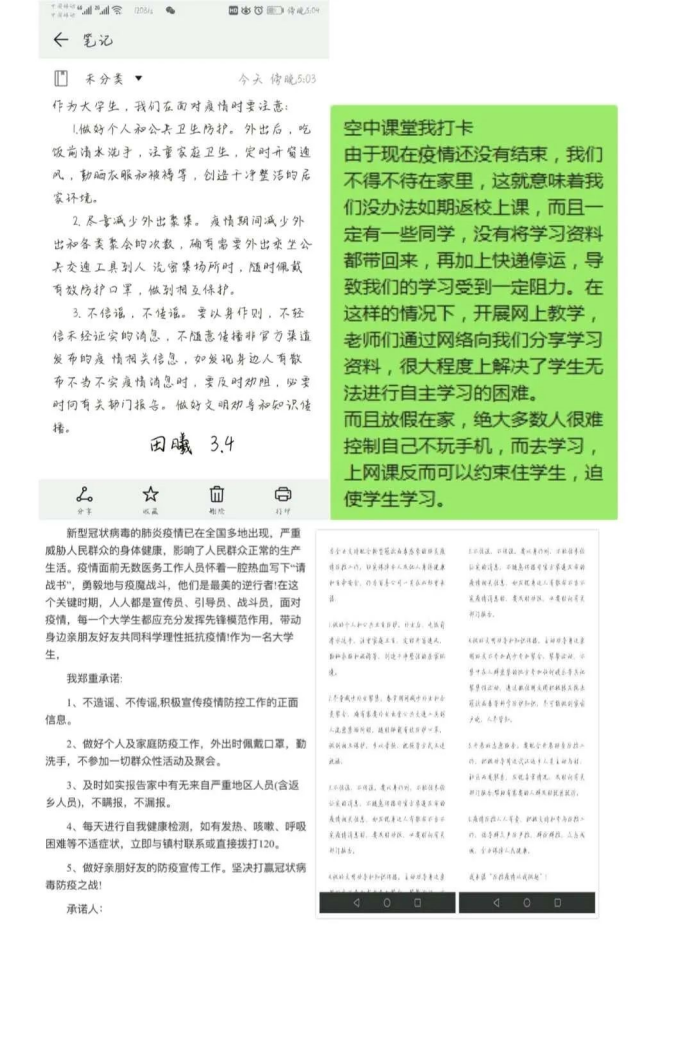 3.调整心情,准备开学。疫情的发生可能使同学们的心情受到了很大的影响在,每天都在关心着疫情的新情况,但是疫情期间,我们还是要严格遵从学校“停课不停学”的要求,准时上课不缺课,认真听课,用知识和专业技能武装自己,为肩负起自己的责任而努力学习。积极进行网络课程学习,珍惜网络学习机会,端正学习态度,营造学习氛围,加强自我管理和约束,严格要求自己,通过此次机会,学会独立学习,按时完成学习任务、积极配合任课教师完成线上授课的各项任务。