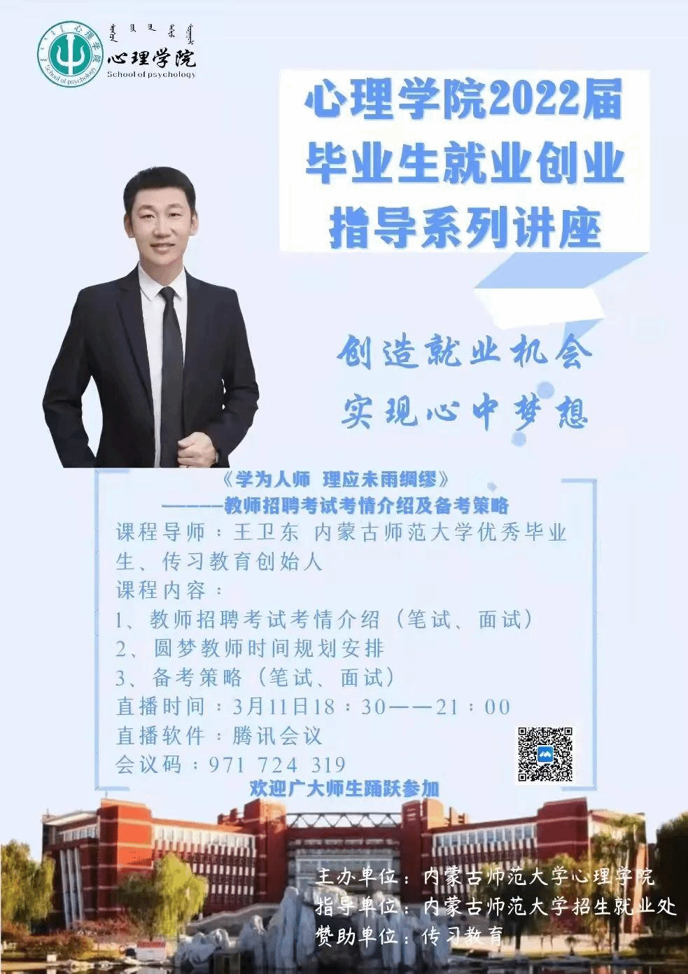 为贯彻党中央、国务院“稳就业”“保就业”决策部署,落实学校推进毕业生就业工作要求,促进我院毕业生高质量就业。2022年3月11日,新2最新登录口特邀请优秀校友、传习教育创始人王卫东为同学们开展“《学为人师 理应未雨绸缪》--教师招聘考试考情介绍及备考策略”专题讲座,学院党委副书记副院长张晓阳参会,学生工作与就业指导办公室主任张金钟主持。