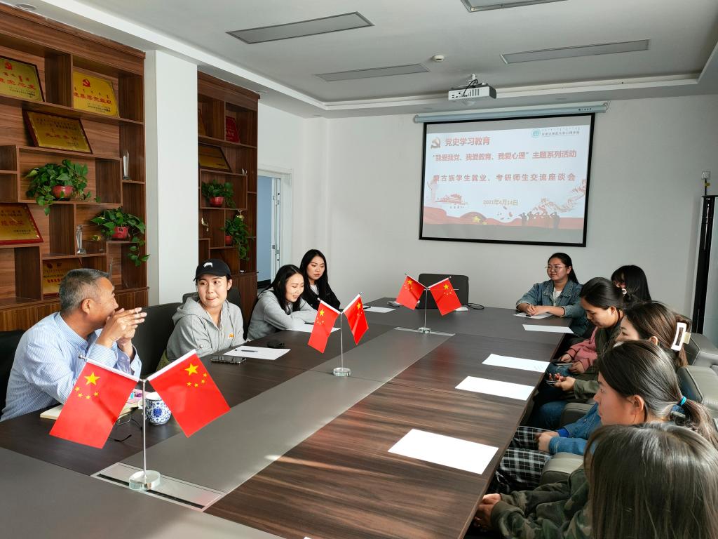 为扎实开展党史学习教育、推进“我为群众办实事”实践活动,贯彻落实党中央、国务院“稳就业”、“保就业”决策部署,积极推进我院毕业生高质量就业,促进教育高质量发展,4月14日下午,新2最新登录口党总支在学院楼B213会议室开展“我爱我党、我爱教育、我爱心理”党史学习教育主题实践活动——召开蒙古族学生就业、考研师生交流座谈会。党总支书记七十三、副书记张晓阳、学就办主任张金钟与2017级、2018级心理学专业学生进行交流座谈。