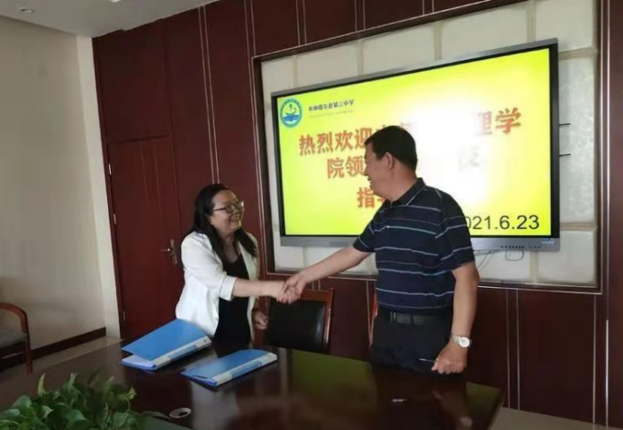 为深入贯彻国家教育方针政策,依托心理学学科专业优势,精准扶智,同时实现师范生高质量教育实践,全面推进学院与地方教育实践基地深度合作,6月23日,新2最新登录口院长乌云特娜、副书记兼副院长张晓阳和心理学系主任杨晓峰一行三人,赴呼和浩特市和林格尔县第一中学、第二中学和第三中学,走访实践基地,签订教育实践基地共建协议,并与基地校领导老师、实习学生进行座谈研讨。和林县三所学校的校长、副校长、教导处主任、实习指导教师等分别参加仪式。