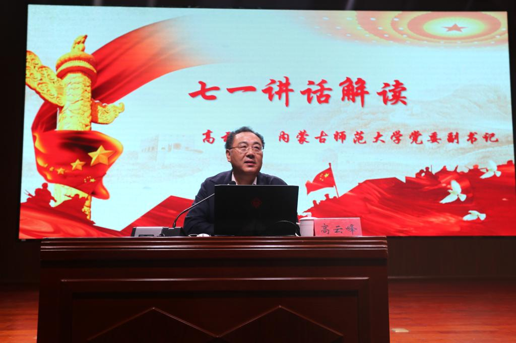 9月23日下午,校党委副书记高云峰在盛乐校区图书馆二楼报告厅为新2最新登录口、旅游学院、历史文化学院、文学院、政府管理学院和科学技术史研究院全体师生党员作“习近平总书记在庆祝中国共产党成立100周年大会上的重要讲话精神解读”专题党课。旅游学院党委书记郭明华主持党课。